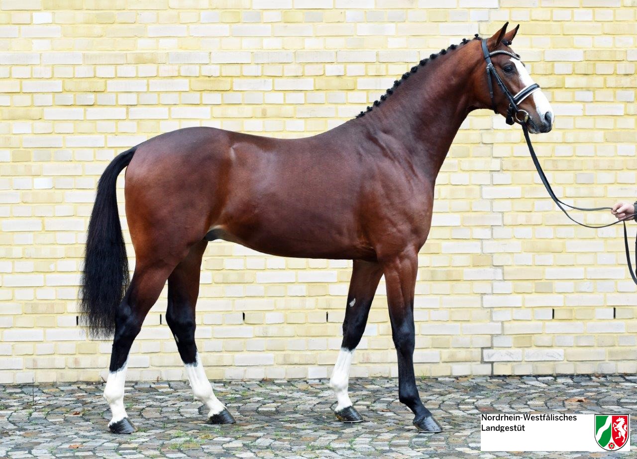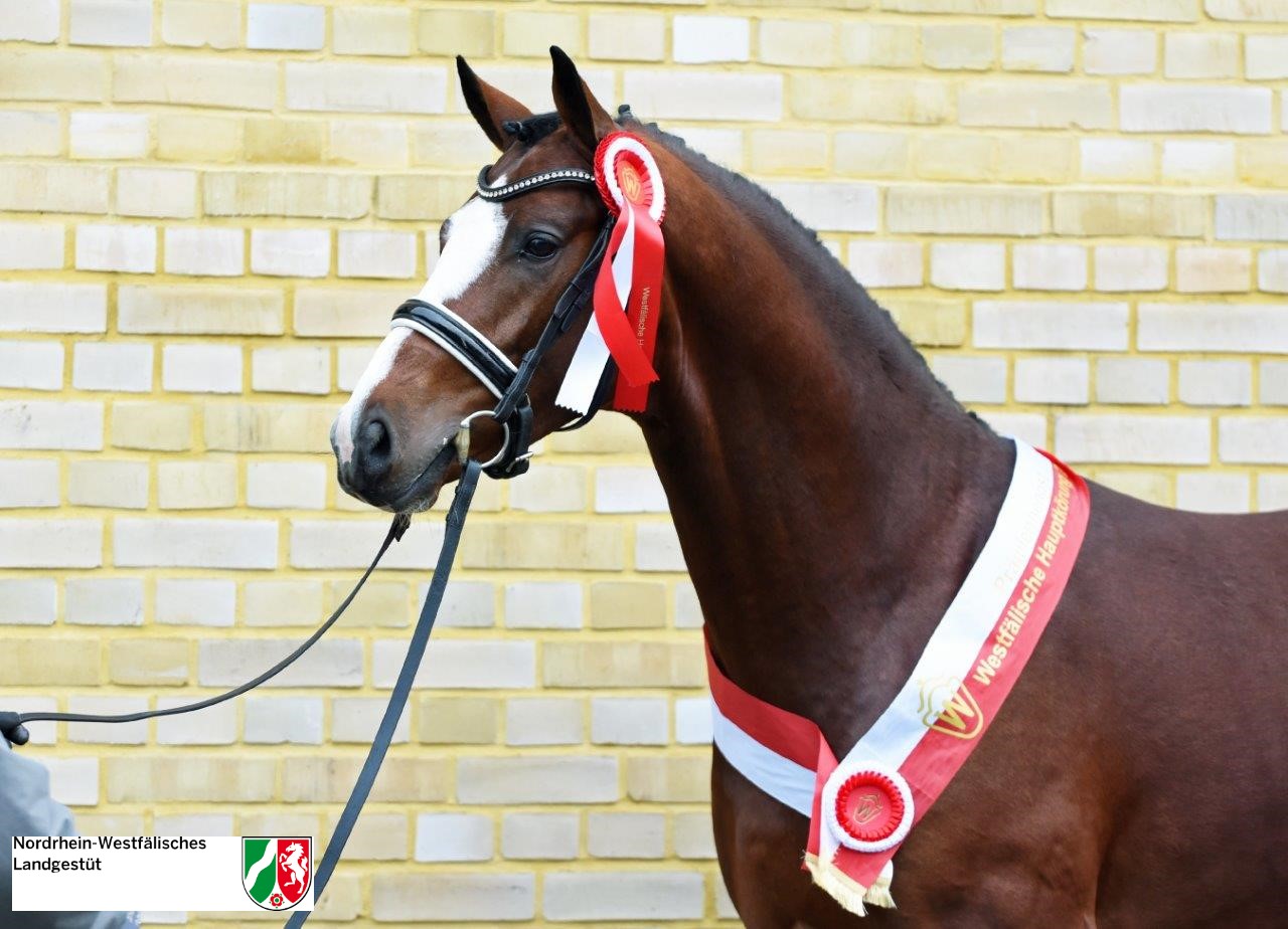De tophengst GLOBAL DANCER presenteerde zich met uitstekende basiskwaliteit en ontspanning op het Westfaalse keuringsterrein. Dankzij zijn vlekkeloze bouw, voortreffelijke beweging en prestatiebereidheid oogstte de modern ogende hengst veel lof. GLOBAL DANCER imponeert met een ruime stap, een expressieve draf met uitstekende achterhandactiviteit en een magnifieke galop bergopwaarts.